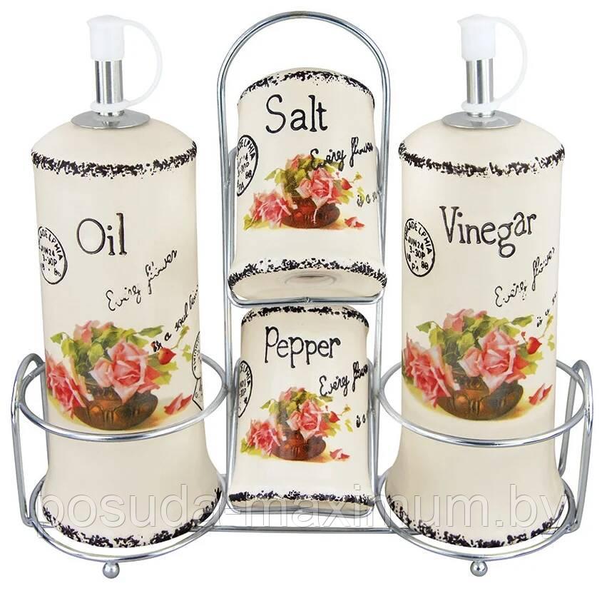 Набор для специй Maestro MR 20050-04S состоит из 4х керамических емкостей для сыпучих и жидких приправ на металлической подставке. На переденй части изображен цветок розы и название содержимого. В состав набора входят емкости для уксуса, масла, соли и перца.
